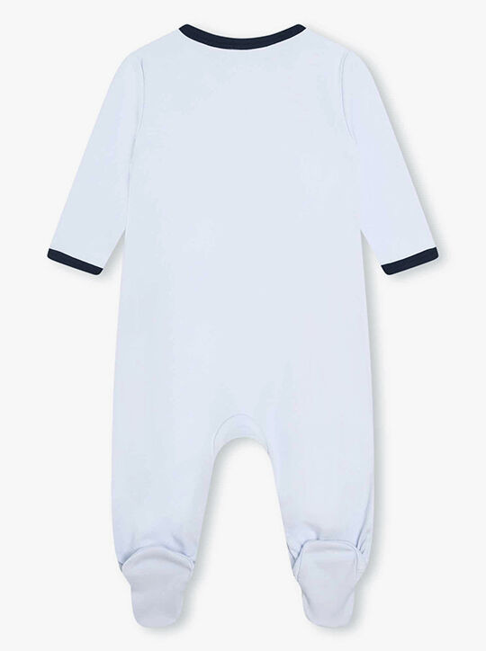 Ensure baby drifts off to dream land in this soft cotton sleep set. The long-sleeve footed onesie will keep them cozy, while the matching fold over hat will ensure their head stays warm during chillier months. Our logo charm provides a subtle signature finish.