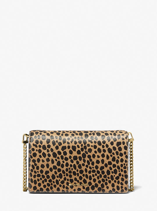 Crafted from cheetah-print calf hair and finished with a gleaming chain strap, the Jet Set crossbody is an ideal travel companion. The slim silhouette is well-sized to carry your everyday essentials and features an interior zipper compartment and multiple card slots to keep you organized. Remove the strap to carry it as a chic clutch.