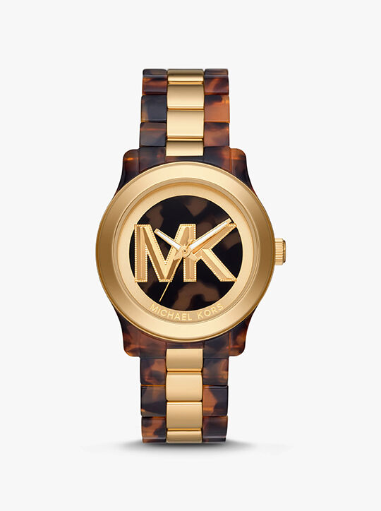 A small timepiece that makes a big impact, our beloved Runway watch gets a modern update. Crafted from an elegant mix of gold-tone stainless steel and tortoiseshell acetate, this eye-catching style features a sleek dial finished with our MK initials. Stack it with complementing jewelry for a layered, cool-girl look.
