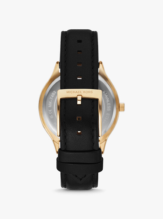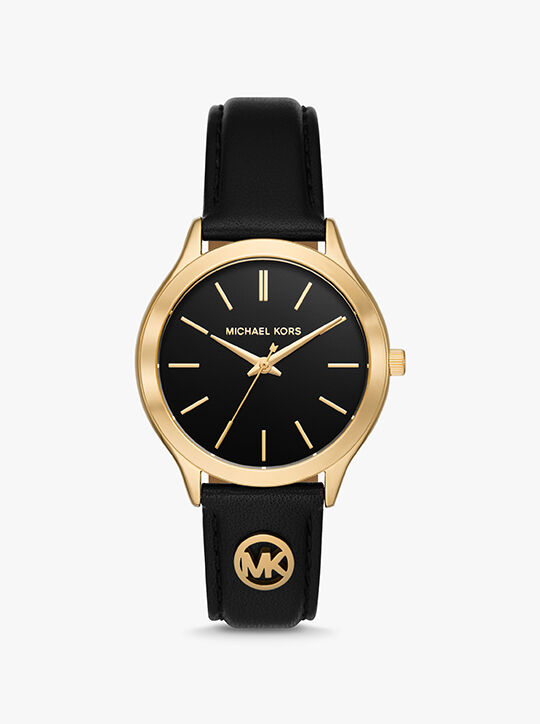 Our coveted Slim Runway watch is reimagined with a versatile leather strap for modern appeal. Designed with a sleek black dial, it features gold-tone hardware to add a gilded touch to your favorite looks. Stack it with an arm full of complementing jewelry on off-duty days, or slip it on as its own standout piece when you’re headed to the office.